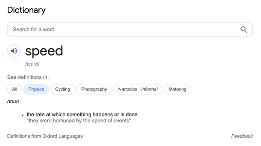 Speed. (2021). In Collins Dictionary. Retrieved from https://www.collinsdictionary.com/dictionary/english/speed